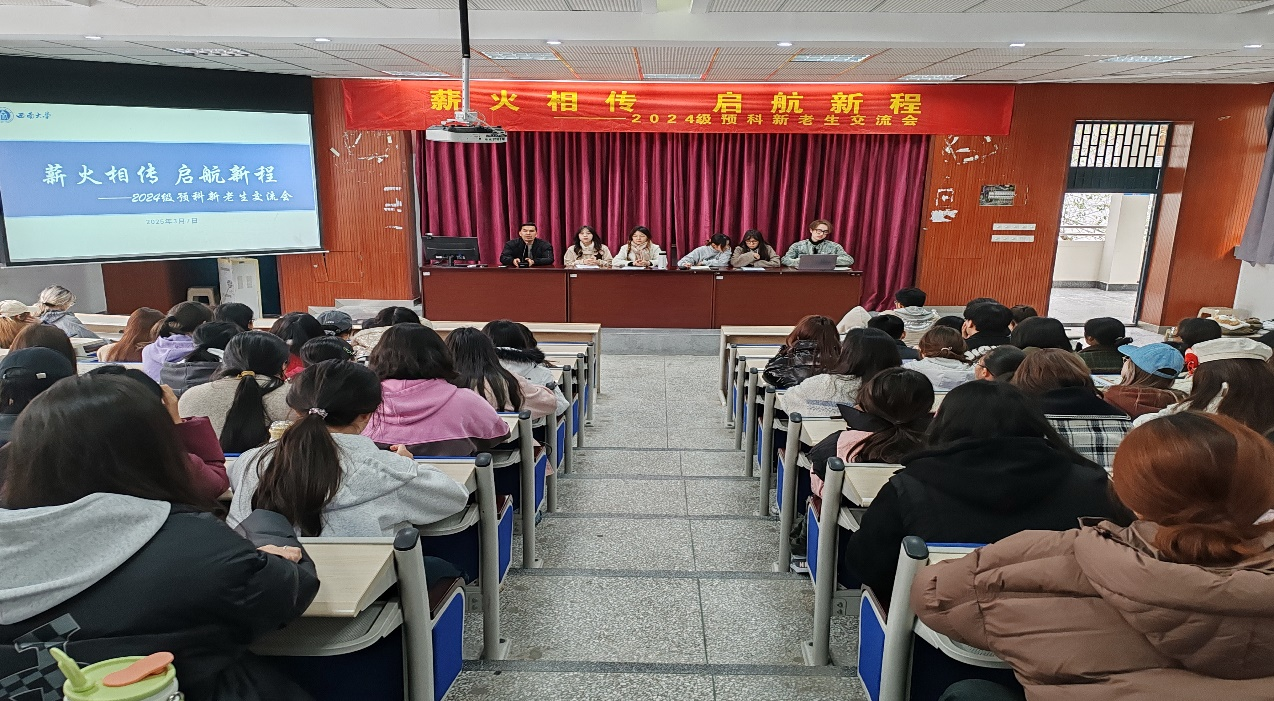 为了加强预科新老生经验交流,解答预科同学在学习及本科专业选报方面的疑惑,帮助建立更加清晰的学业生涯规划,2025年3月7日下午,西南大学2024级预科新老生交流会在荟文楼442举行。交流会由辅导员亚库普主持,2022级和2023级共五名往届预科学长学姐喻美龄、 唐亚洁、邹雨涵、卓格尔措、努尔博力·阿扎提做分享交流,2024级全体预科学生参加。