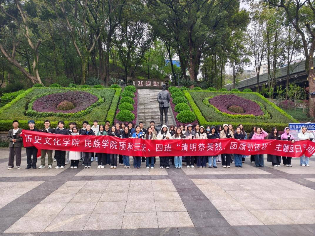 2024级预科三班、四班团支部于3月30日上午前往北碚张自忠烈士陵园开展以“清明祭英烈,团旗引征程”为主题的祭扫活动。本次活动旨在通过祭扫活动,让同学们在缅怀先烈的过程中接受深刻的爱国主义和革命传统教育,进一步增强同学们的历史责任感和使命感。本次活动由2024级预科三、四班共同策划实施,2个班级全体团员和部分同学参与。