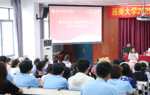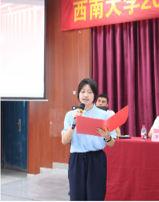 任课教师代表孙卫红老师用真挚的情感寄语新生们要认真学习、自立自强。孙老师强调,在西南大学雄厚的师资力量托举和自身不断成长的努力下,大家定能迎接美好未来。她勉励各位预科新生永葆真善美,不负青春韶华,在民族团结的旗帜下共同感受预科学习生涯的美好。
