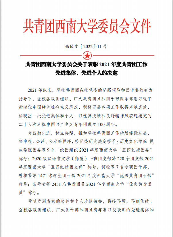 《共青团西南大学委员会关于表彰2021年度共青团工作先进集体、先进个人的决定》于近日发布。足球即时比分直播