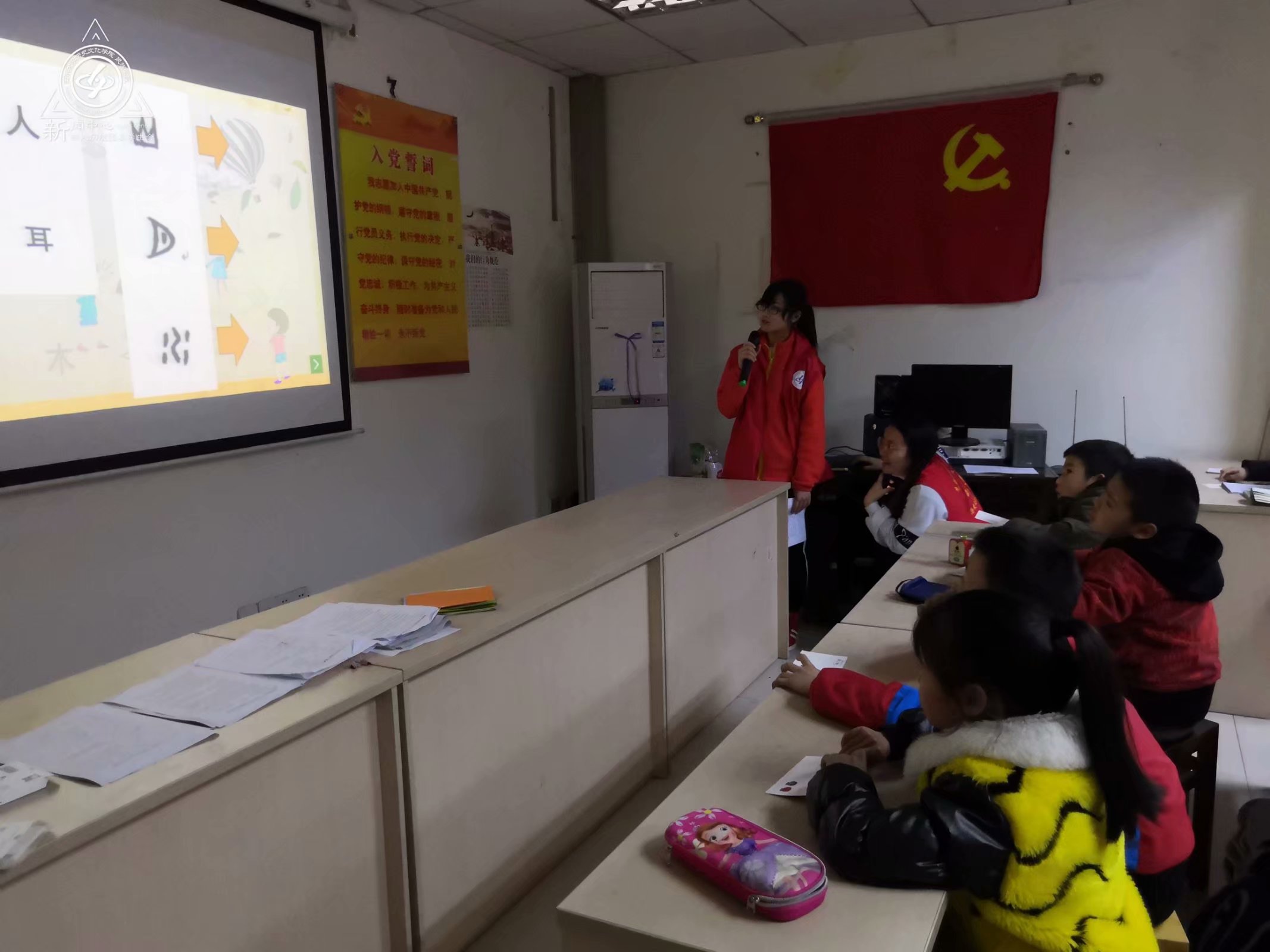 在作业辅导结束后,汉字主题活动正式开始。志愿者们首先为小朋友们播放了仓颉造字的动画,小朋友们初步了解了汉字产生的渊源,并意识到汉字文化的源远流长。之后志愿者们又向小朋友们展示了象形文字,并让小朋友们积极猜测这是现代汉字的什么字,在此过程中,小朋友们深刻体味象形文字的特点,更深刻体会到了汉字的魅力。
