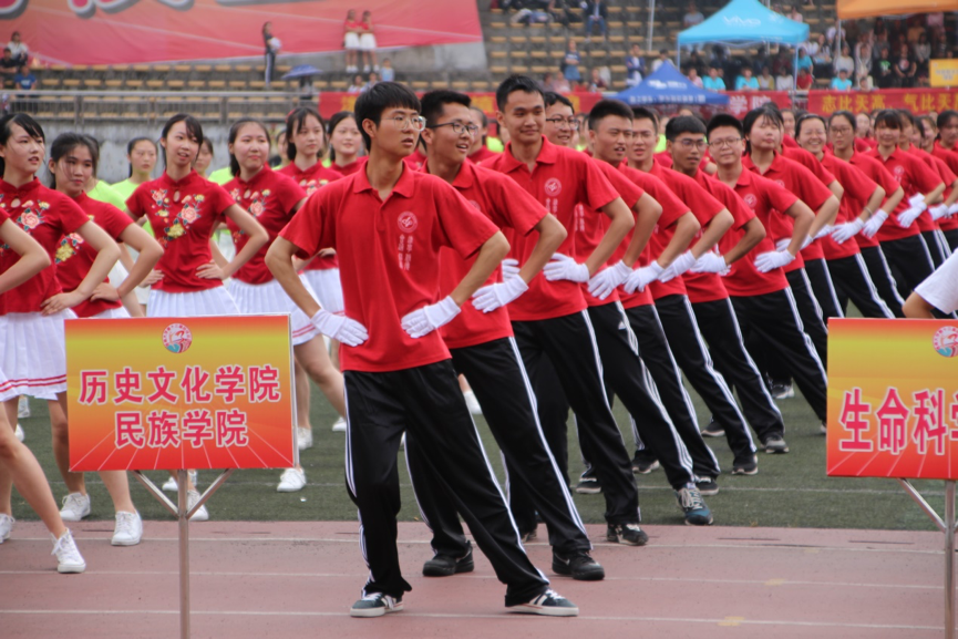 的学生身着民族服饰,向看台及主席台挥手示意并保持微笑,一张张年轻的面庞,散发着青春朝气,写满了斗志昂扬。