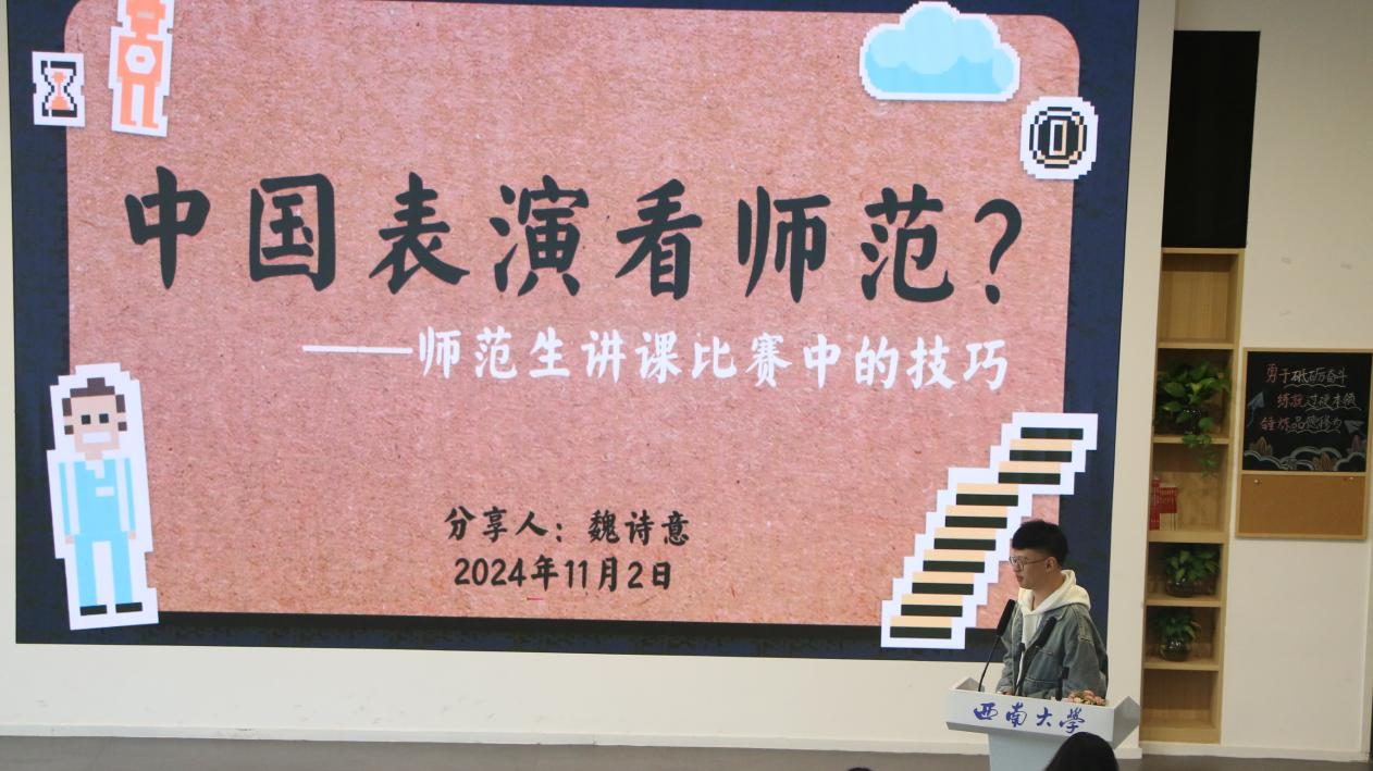 魏诗意学长着重分享了讲课实操中的技巧。在教学设计上,他强调应通过制造认知冲突和设置问题链条等方式设计出“有灵魂”的导入,一个有效的导入不仅可以激发学生和评委老师的听课兴趣,还能起到提纲挈领的作用。在课堂语言方面,他提出讲课要“让语言有历史味”,即讲课语言应具备准确性、逻辑性和厚重感。在授课过程中,他指出可以通过创设合理情景来调动课堂,从“立足当下”(如采用数字图书馆或剧本杀等方式)和“回到过去”(以历史真实事件为例)两个角度进行创设。最后,学长还分享了一个小诀窍——结课环节可以设计一个时间可调节的活动来“防患于未然”。