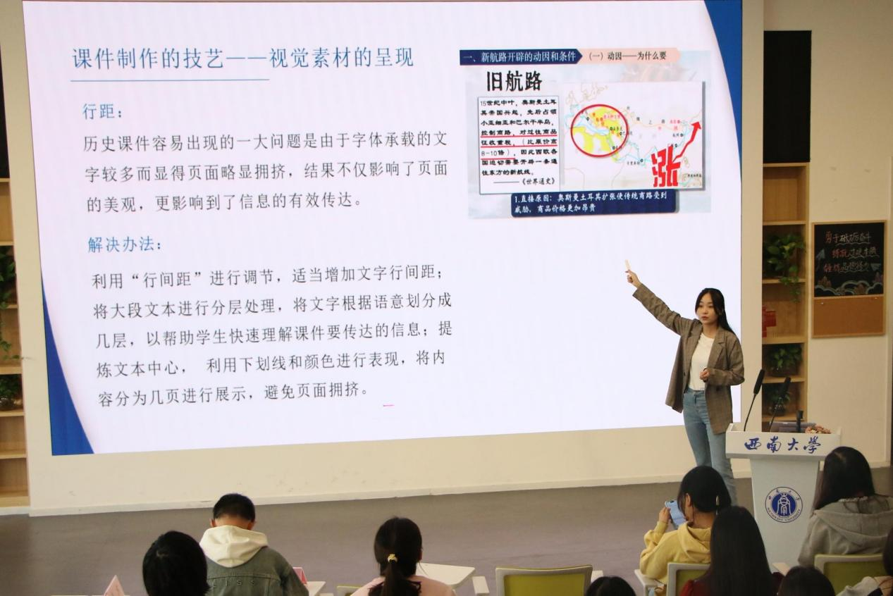 在配色风格上,要寻找与主题契合的配色;在图片处理上,可通过抠图的方式将其呈现在PPT上;在动画设置上,不仅可以采用多种切换效果,还可与历史地图结合设置路径动画,将知识点动态化,从而达到深入浅出的效果。此外,学姐还推荐了历史园地、每天一个历史课件、高中历史教研等资源收集公众号。她鼓励大家形成自己的PPT风格,积极参与比赛,以赛代练,不断提升课件制作水平,为今后的课堂展示以及赛课做好充分准备。