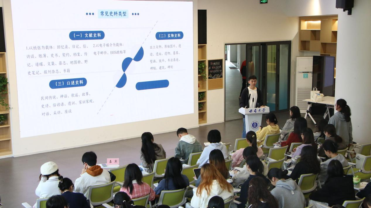 本次沙龙邀请了杨俊杰、程意乔和魏诗意三位优秀学长学姐,他们分别围绕“如何利用图书馆资源与其他渠道寻找对应史料”“如何设计好一个历史讲课PPT”与“在师范生讲课比赛中,有什么讲课技巧与方式能锦上添花”三个主题进行经验分享。