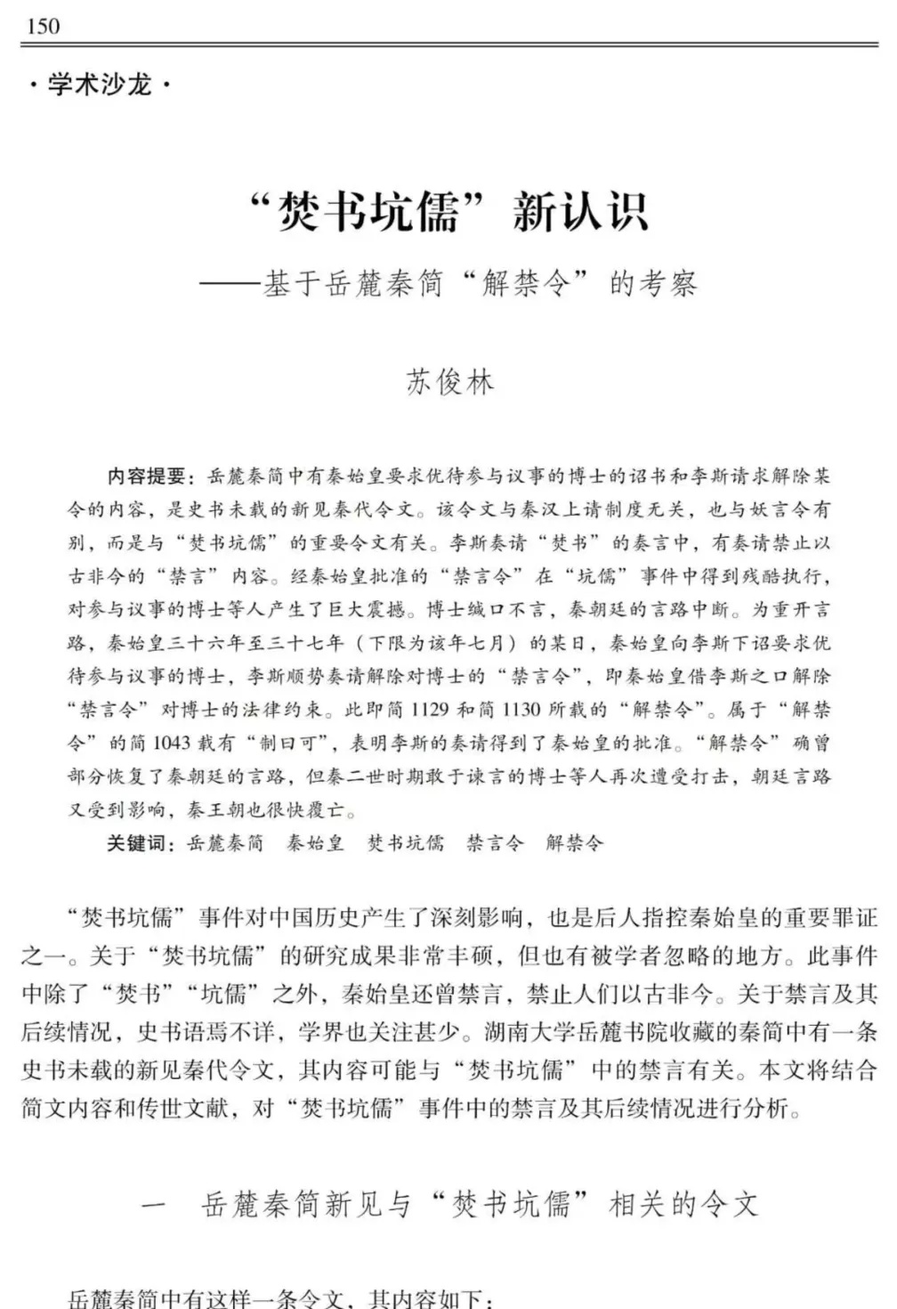 苏俊林教授的学术论文《“焚书坑儒”新认识——基于岳麓秦简“解禁令”的考察》。