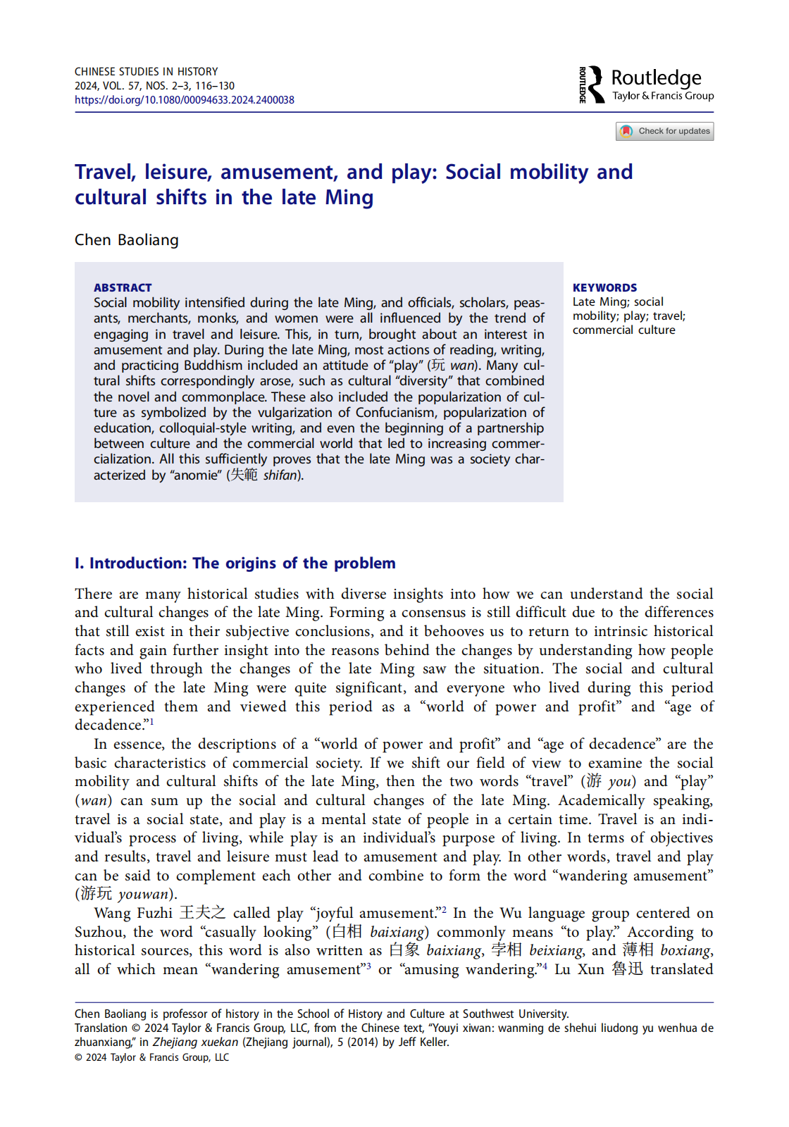 CHINESE STUDIES IN HISTORY(《中国历史研究》)是由Taylor & Francis 出版的国际学术期刊,以译介、发表中文学界重要的历史学研究成果为宗旨,在国际学术界有较大影响,被国际重要期刊索引数据库A&HCI(艺术与人文科学引文索引)收录。陈宝良教授长期耕耘明代社会史,关于明代社会流动与文化变迁的研究,得到了海外学界的高度关注。