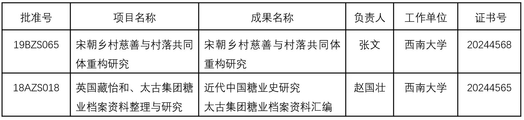 赵国壮教授的“英国藏怡和、太古集团糖业档案资料整理与研究”、张文教授的“宋朝乡村慈善与村落共同体重构研究”以优秀等级结项!
