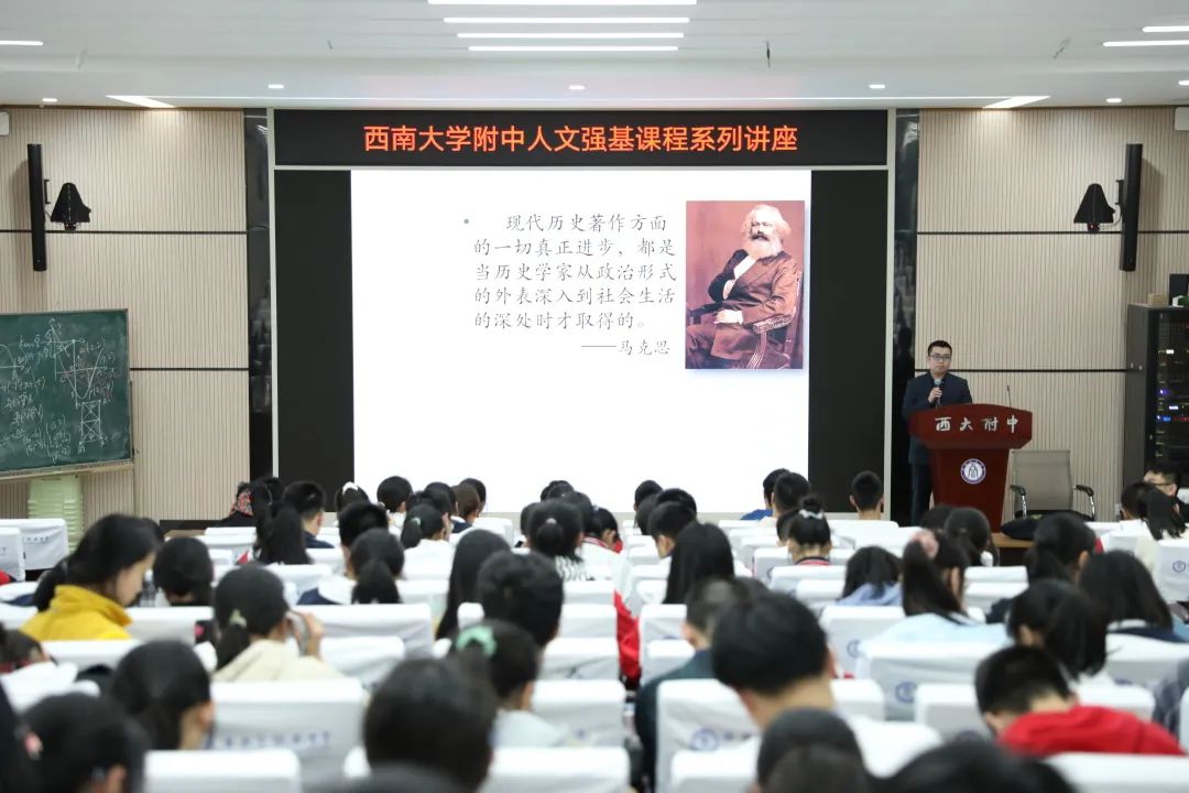 副教授侯振兵为附中学子带来了一场精彩的讲座:唐代衣食住行漫谈——以白居易诗为线索。西南大学附中初中历史教研组长赵敏岩老师担任讲座主持。
