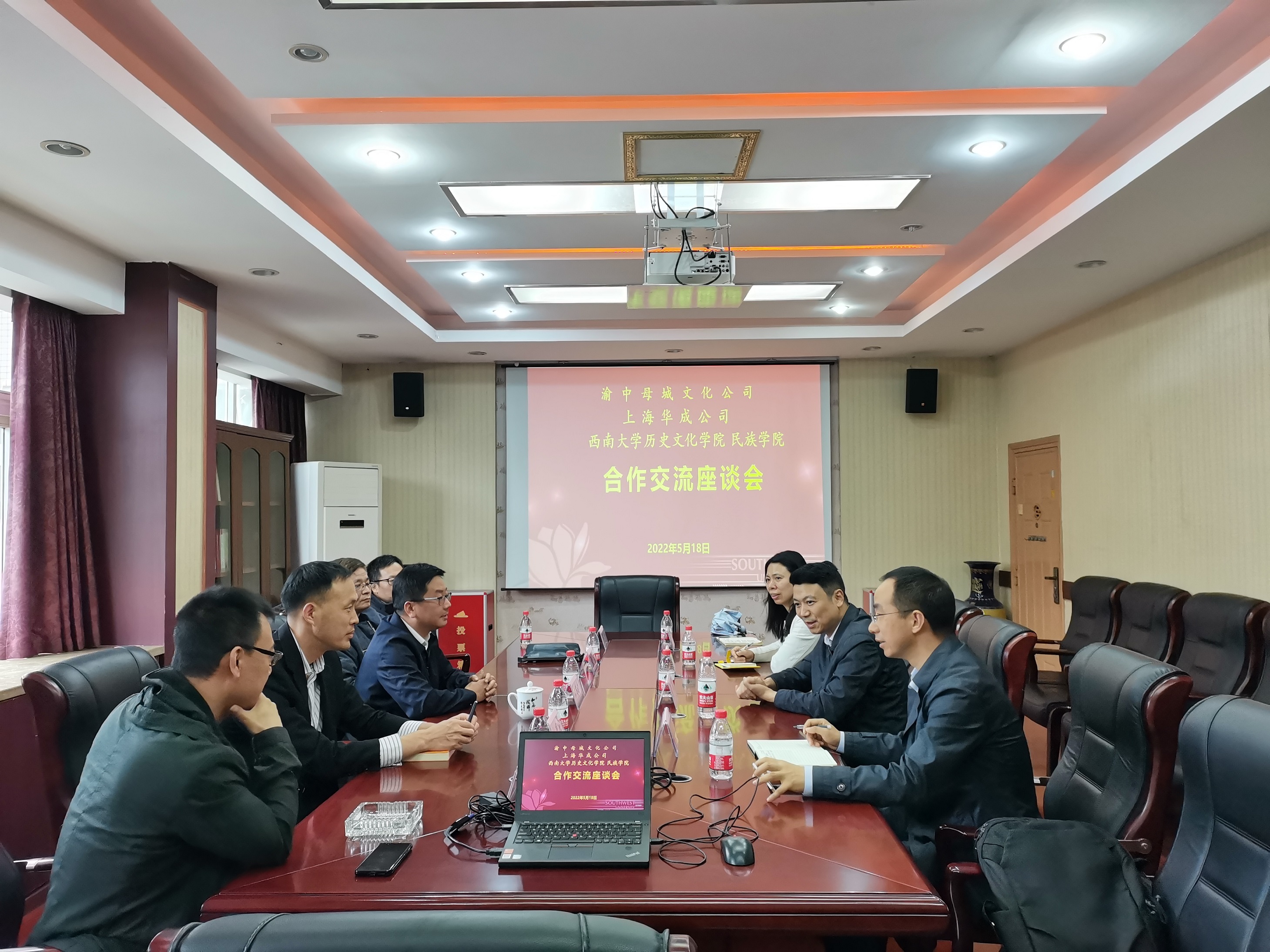 2022年5月18日下午,渝中母城文化公司董事长柯苇、上海华成公司经理项立波一行,来院开展合作交流。邹芙都院长、赵国壮副院长、张文教授、谭刚教授、卞兆明副教授参加交流会。