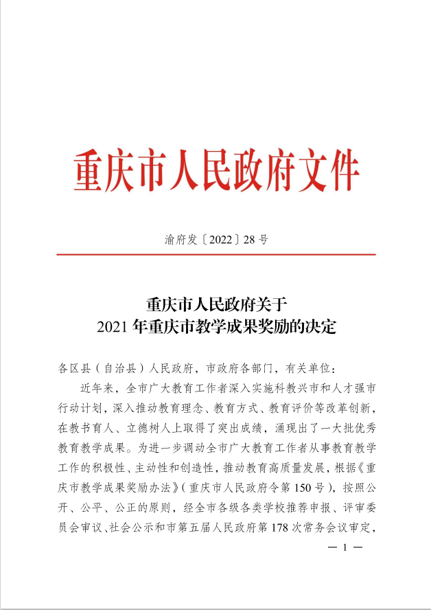 近日,重庆市人民政府公布了《关于2021年重庆市教学成果奖励的决定》(渝府发〔2022〕28号)。由足球即时比分直播