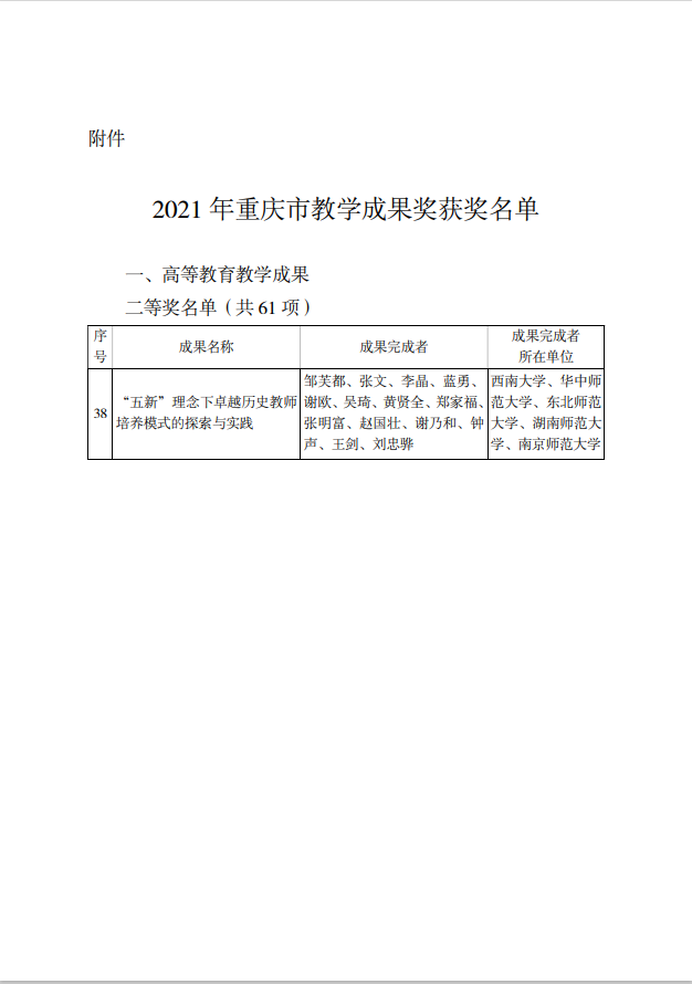 牵头并协同4所双一流师范院校历史学国家一流本科专业建设点共同申报的《“五新”理念下卓越历史教师培养模式的探索与实践》荣获2021年重庆市教学成果奖高等教育教学成果类二等奖。