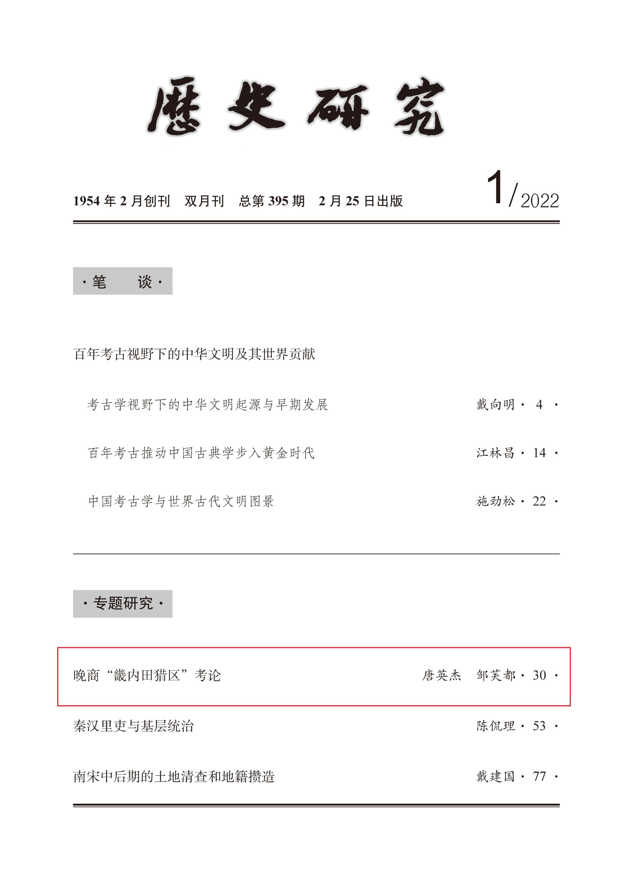 唐英杰博士后与邹芙都教授合作的《晚商“畿内田猎区”考论》一文在《历史研究》2022年第1期发表。该文认为:先秦时期黄河流路相对稳定,可作为研究商代地名的参考坐标。甲骨文中所见地名柚、𠵤靠近商王都“大邑商”,柚、粪、黎、鲧、襄、协、就、向在黄河左近;以它们为定点,卜辞中出现频率较高的敦、疐、梌、宫、盂、丧等地可系联在一起,构拟出一个以黄河为中心的田猎地分布网络。该网络基本位于晚商王畿地区,即今河南省安阳市、鹤壁市、濮阳市及周边区域,可称之为“畿内田猎区”。