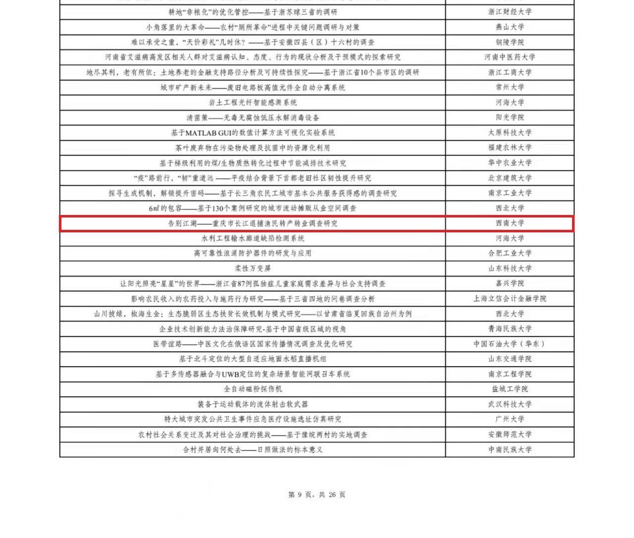 田阡教授、付来友、庄伟老师指导,潘明露、赵旭阳、罗曦、杨荆夫、杨紫淳同学完成的《告别江湖——重庆市长江退捕渔民转产转业调查研究》荣获二等奖。据悉,本次决赛西南大学共获得二等奖3项,三等奖2项。