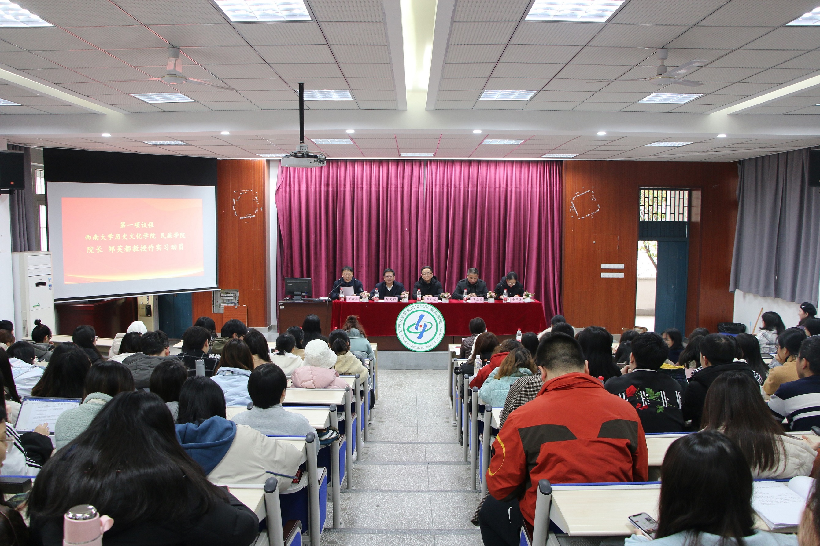 党委书记郑家福以及本次实习指导教师袁从秀、曹华清、谢欧、范敏与会指导,会议由罗朝斌主持。动员会后,西南大学附属中学历史教研组组长杨泽新老师和地理教研组组长向颢老师到会分别做试教试作工作相关培训。