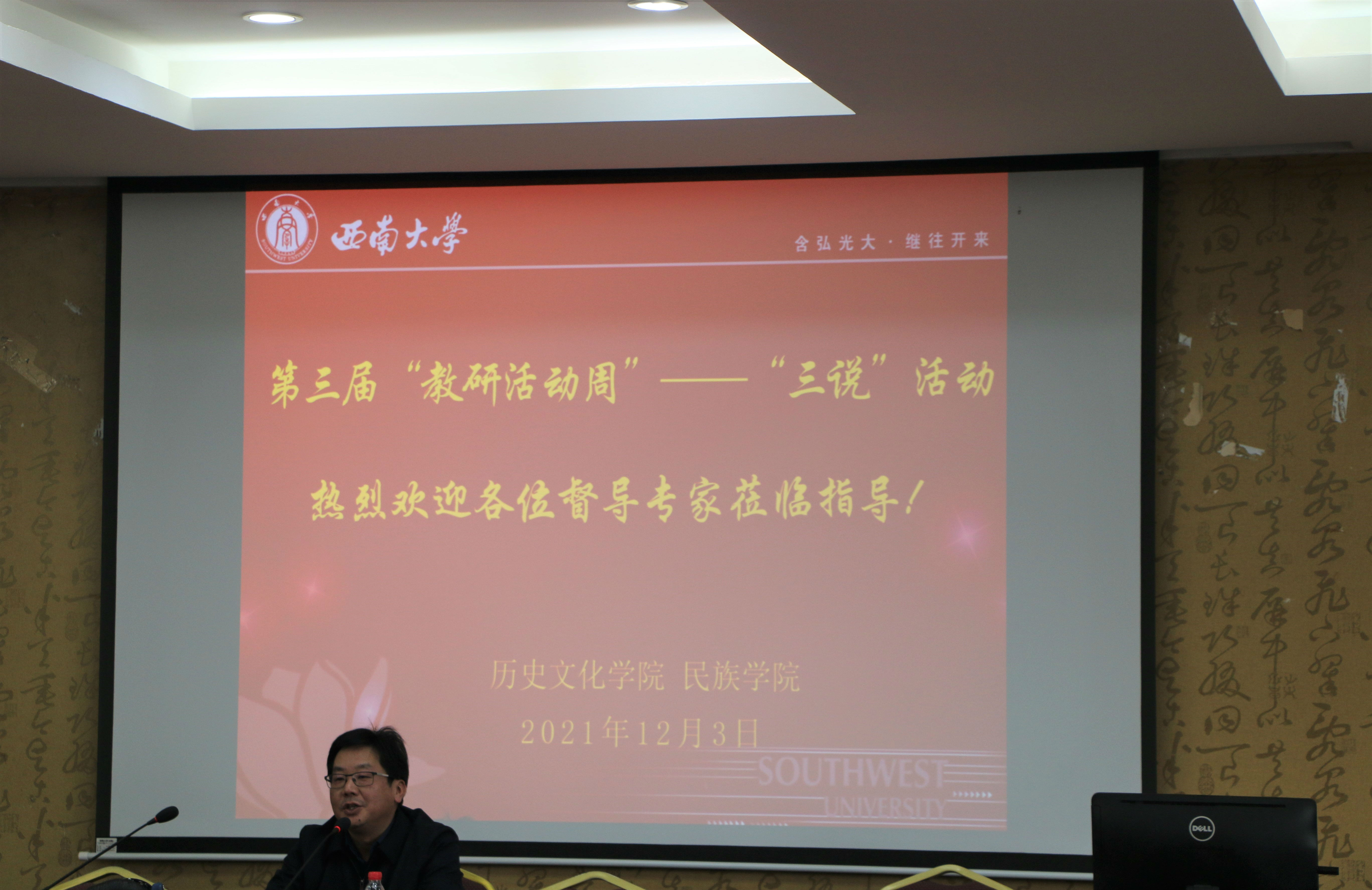“教师说教学”环节,谭刚教授和陈永亮副教授分别介绍了“中国近代史”和“民族理论与政策”的课程思政建设情况。谭刚教授回顾了中国近现代史课程的建设历程,总结了“中国近代史”获批国家一流课程、入选首批国家课程思政示范课程的建设经验;他介绍,团队教师在横向上讲好专业核心课、扎实学生专业基础的前提下,还依据个人专业特长,向学生开设了十余门纵向的拓展研究型专题课程,取得了良好效果。