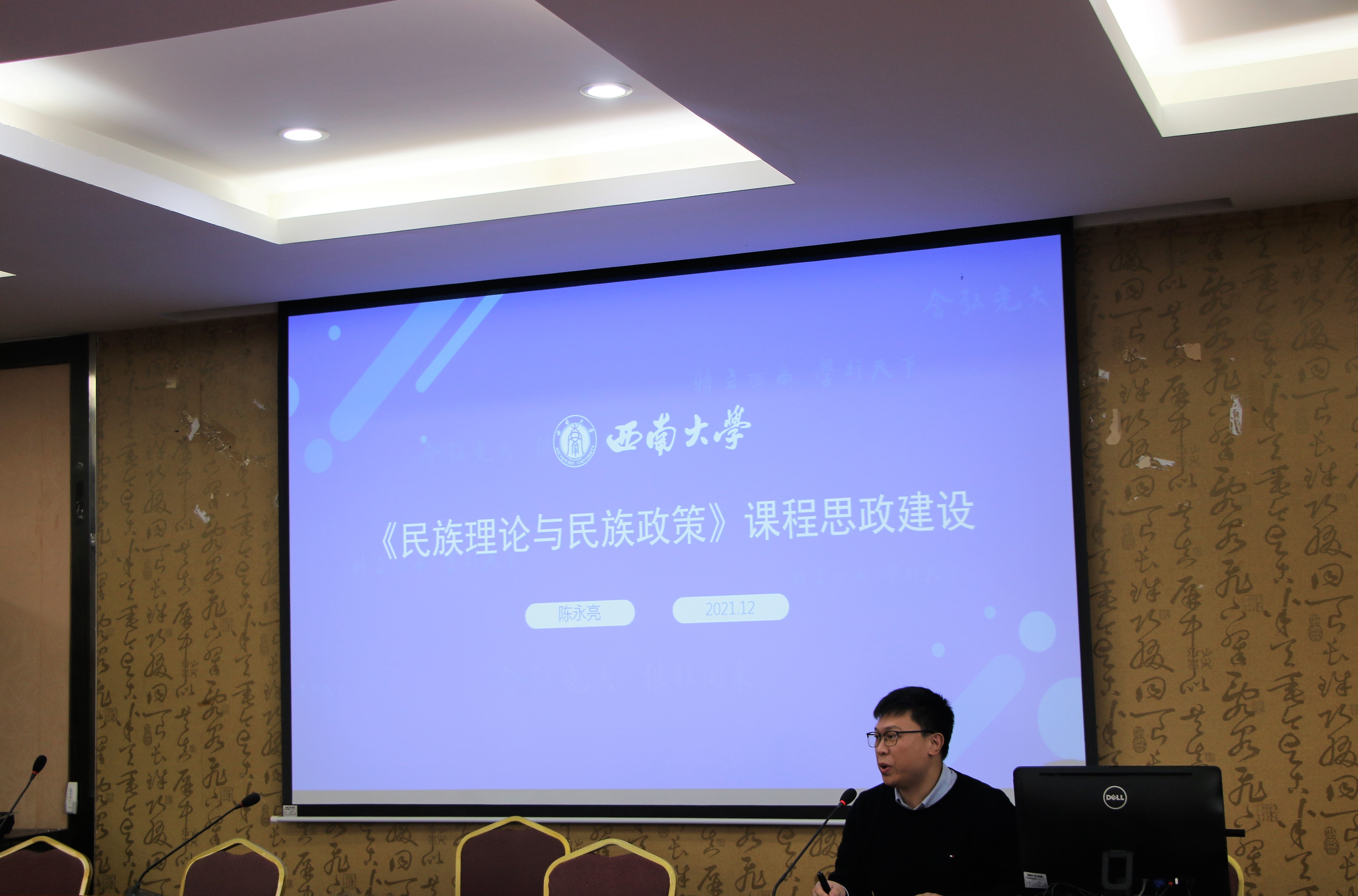 教师积极融入课程思政,除在院内课程中融入相关元素外,还向全校学生开设“抗战精神”思政大课,广受好评。陈永亮介绍了《民族理论与政策》一课的课程设计方法,即通过理论与实践的高度结合,以马克思主义民族理论经典为基,运用多种教学手段,依次达成认知类、方法类、价值类目标,使得学生能充分理解国家的民族理论和自由、平等、公正、法治的核心价值观,清晰认识我国当前的民族政策和相关问题,进而铸牢中华民族共同体意识、为党和国家的民族工作做出贡献。