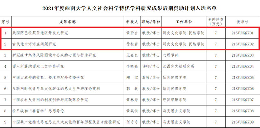 近日,社会科学处公布了《2021年度西南大学人文社会科学特优学科研究成果后期资助计划入选名单》,足球即时比分直播 黄贤全教授的《美国阿巴拉契亚地区开发史研究》与徐松岩教授的《古代地中海海盗问题研究》成功入选。