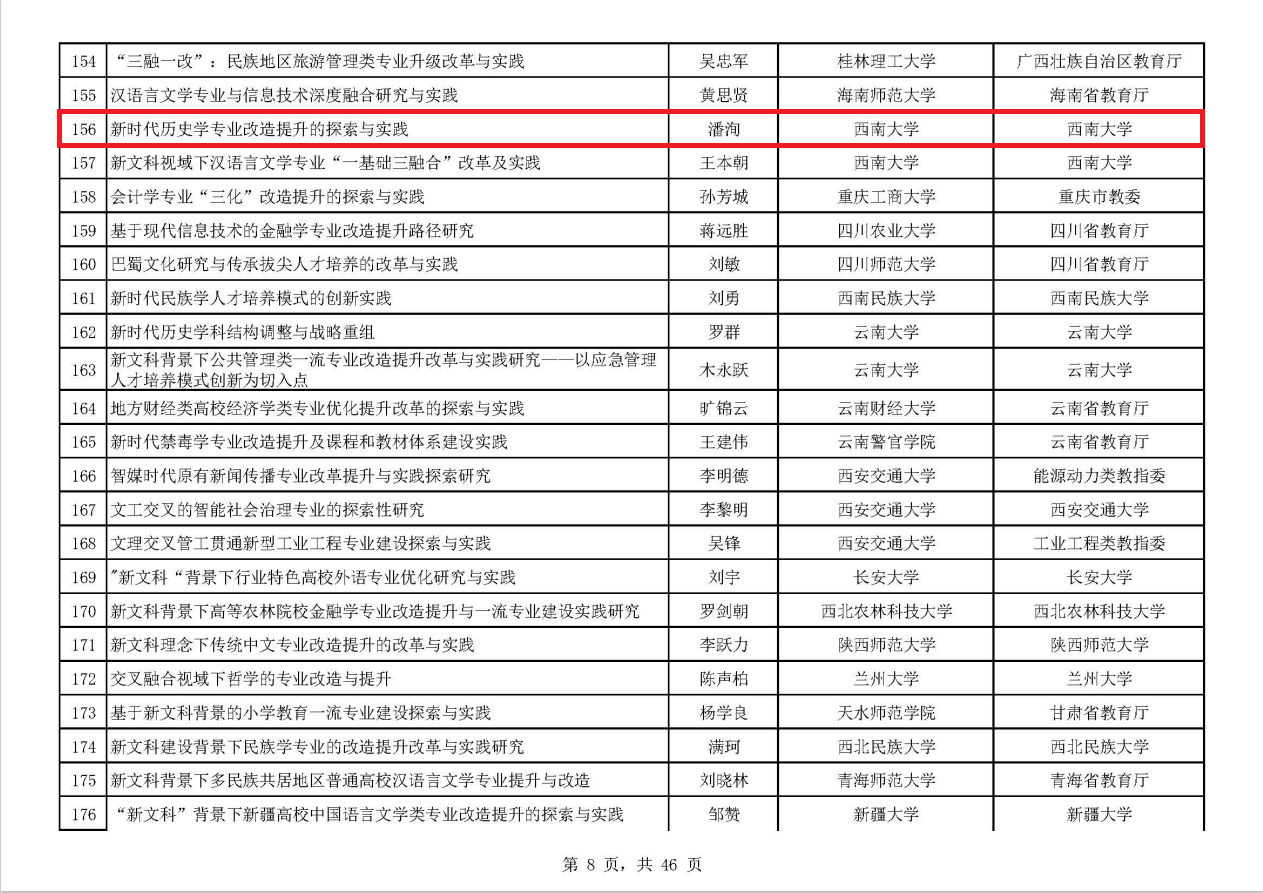 潘洵教授作为负责人申报的《新时代历史学专业改造提升的探索与实践》项目成功获得立项。本次西南大学共有5项获得立项。