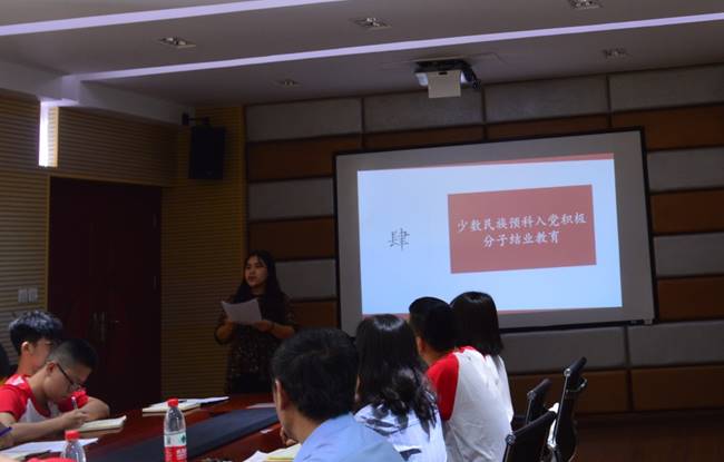 接下来,支部为少数民族预科入党积极分子进行了结业教育。学生代表阿斯古丽用情感真挚的发言、十余位预科积极分子用庄严神圣的学子宣言从不同侧面表达了自己作为中国人、西大人、预科人维护民族团结、服务民族振兴的初心和决心。