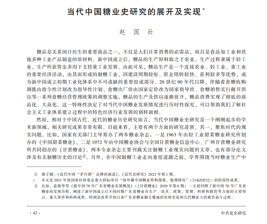 赵国壮教授撰写的论文《当代中国糖业史研究的展开及实现》在《中共党史研究》2024年第1期公开发表。