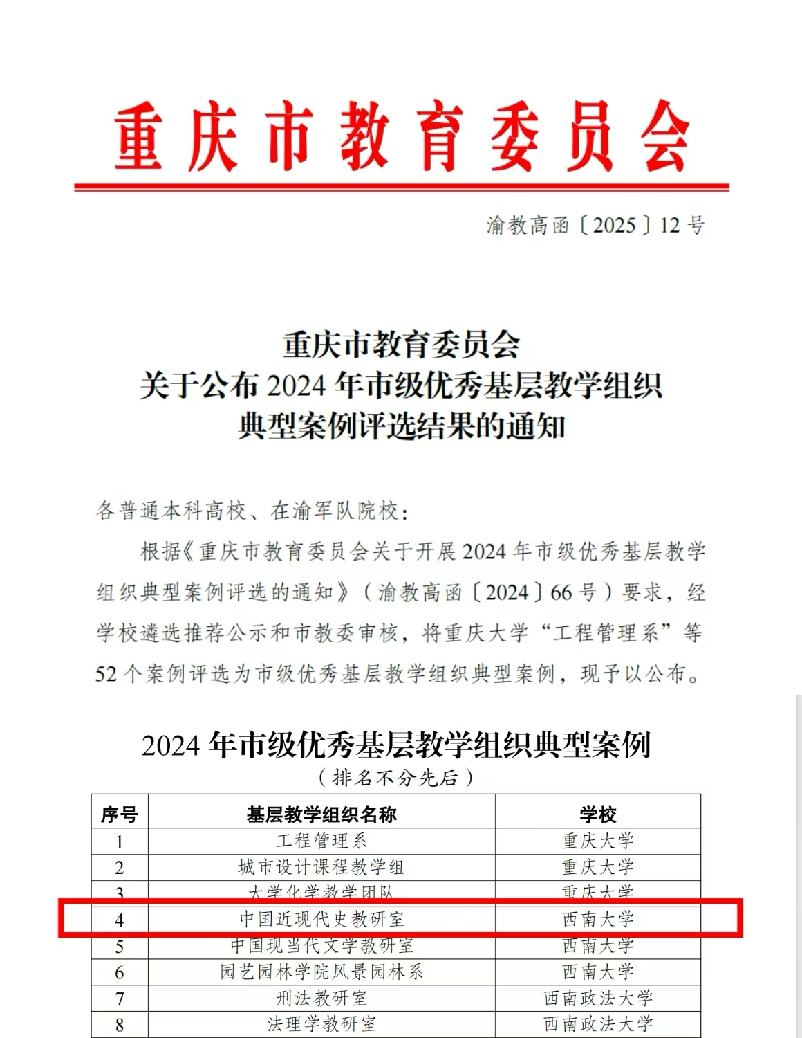 近日,重庆市教育委员会发布《关于公布2024年市级优秀基层教学组织典型案例评选结果的通知》,足球即时比分直播 中国近现代史教研室获评市级优秀基层教学组织。