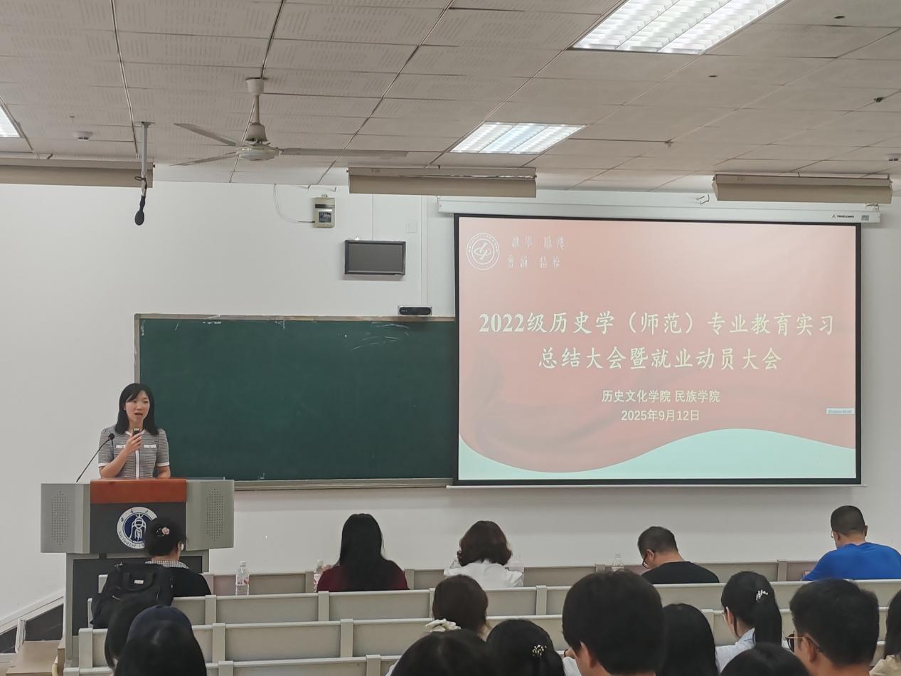 实习指导教师谢欧、杜林泽,2022级辅导员刘玉婷,以及2022级、2023级历史学(师范)专业全体学生共同参会。大会由张静副书记主持,分为教育实习总结和就业动员两个环节。