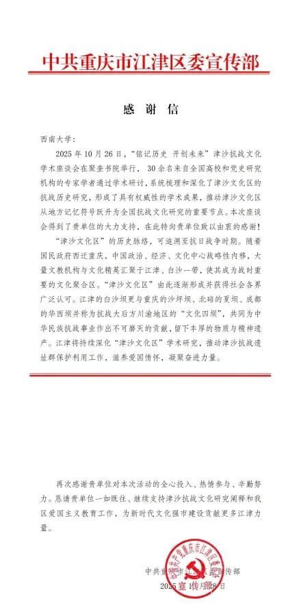 主办,由重庆市历史学会、重庆市重庆史研究会、重庆市抗战大后方历史文化研究会、西南大学指导。会后,中共重庆市江津区委宣传部特向西南大学发出感谢信,对学校为举办此次高规格学术活动作出的重要贡献表示感谢。