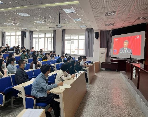凝心聚力新时代,团结奋斗新征程。本次大会主题为:高举中国特色社会主义伟大旗帜,全面贯彻新时代中国特色社会主义思想,弘扬伟大建党精神,自信自强、守正创新,踔厉奋发、勇毅前行,为全面建设社会主义现代化国家、全面推进中华民族伟大复兴而团结奋斗。在近2小时的开幕会中,习近平总书记的报告掷地有声、振奋人心,详尽地描述了党和国家事业取得历史性成就、发生历史性变革,我国正迈上全面建设社会主义现代化国家新征程。师生们认真聆听,不时热烈鼓掌。