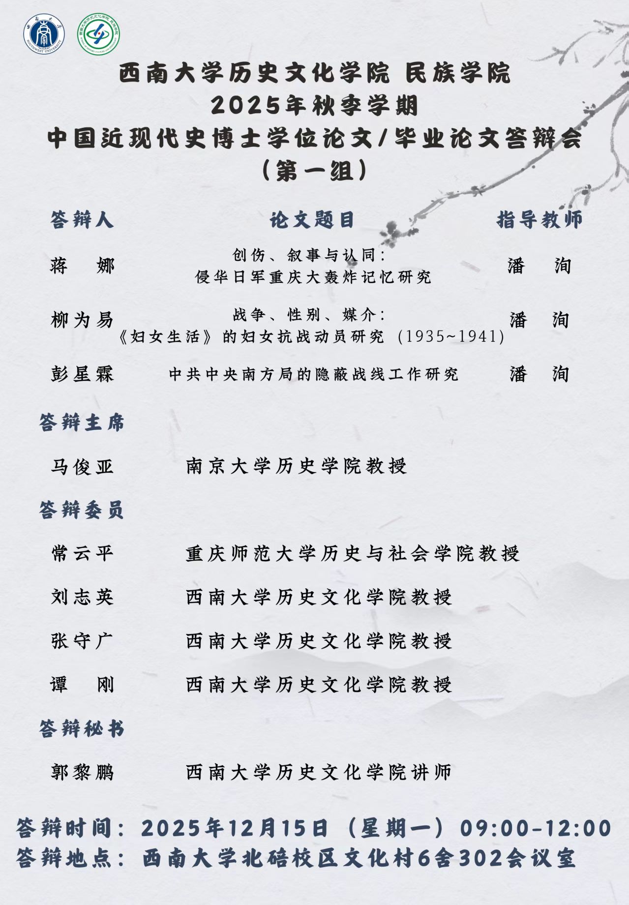 西南大学足球即时比分直播 2025年秋季学期中国近现代史博士学位论文/毕业论文答辩会