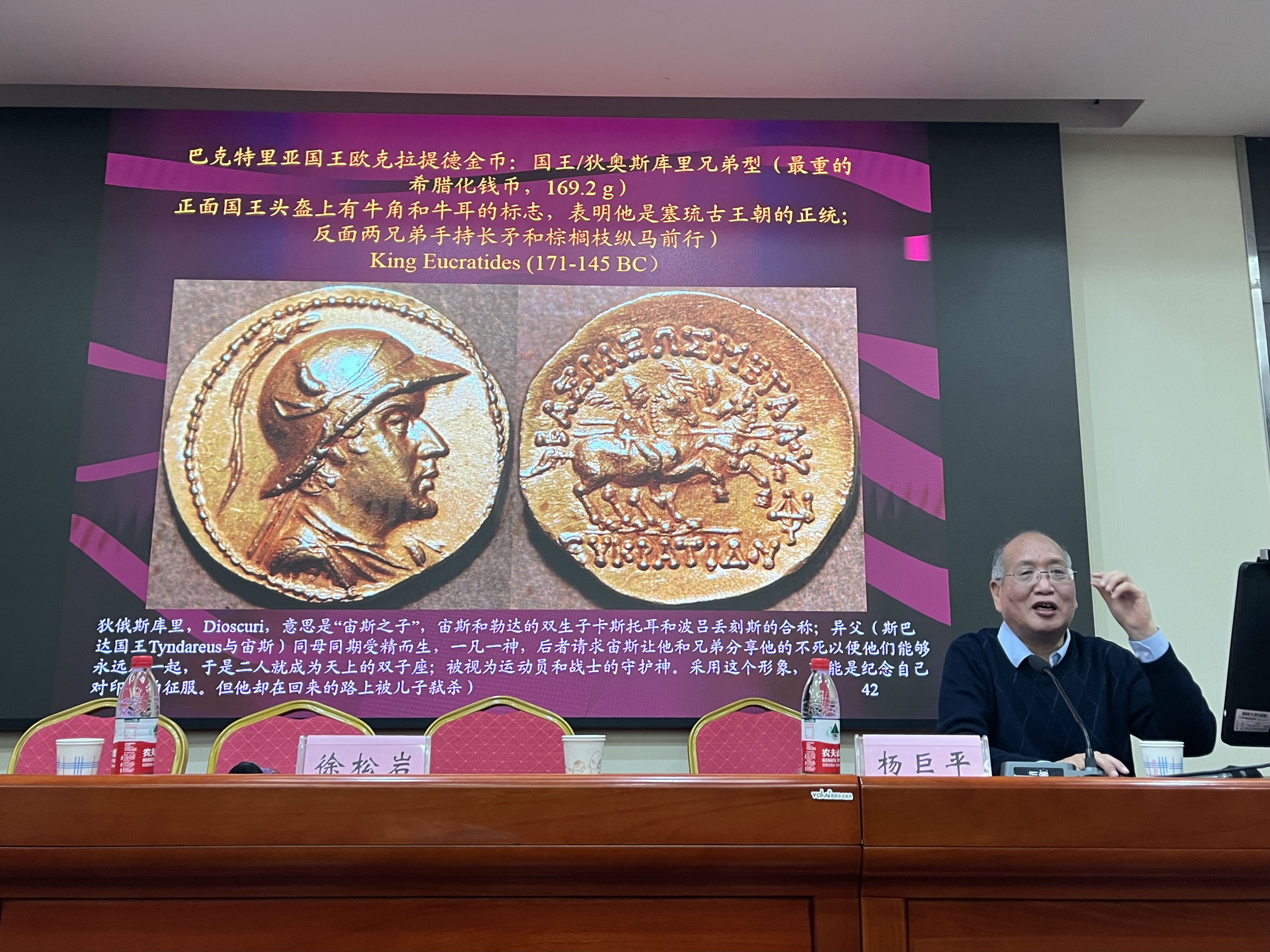 讲座的最后,杨巨平教授总结了希腊式钱币的历史作用。杨教授指出,作为丝绸之路上的主要交换媒介和手段,希腊式钱币直接推动了东西方物质文明的交流;不仅如此,希腊式钱币还承载着各自文化的信息,它们的仿制、改造、流通的过程也是丝路文明交流融合的过程。它们对多元文化的承载和传播,赋予了相关研究以突出的研究价值。