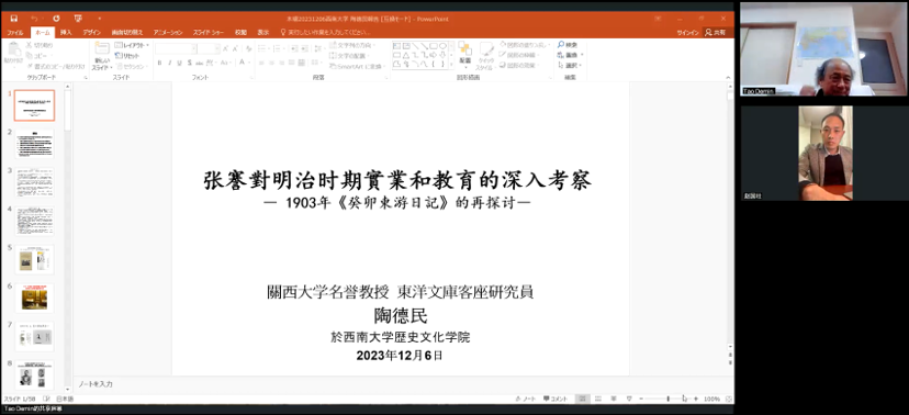2023年12月6日晚7点 ,新一期“嘉陵历史名家论坛”正式开讲。本次讲座采取线上形式,由陶德民教授担任主讲,题目为“张謇对明治时期日本实业和教育的深入考察——1903年《癸卯东游日记》的再探讨”。西南大学足球即时比分直播