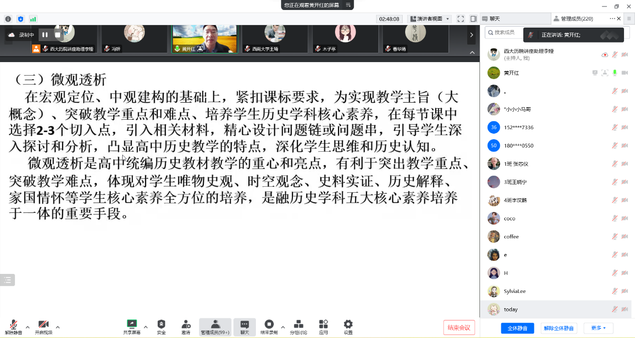本场讲座宏旨为:如何处理教材,满足新时代需要。黄开红研究员围绕三个方面展开全面阐述一、统编高中历史教材应时而生;二、统编高中历史教材教学策略初探——宏观定位、中观建构、微观透析;三、统编高中历史教材教学还宜注意的几个问题: