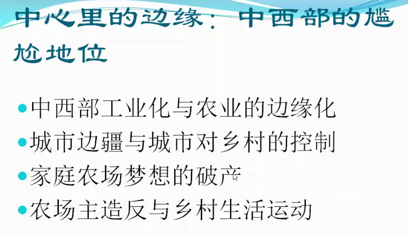 第四,付成双教授认为中西部在19世纪末处于尴尬地位。中西部农村作为城市的腹地,在19世纪美国现代化浪潮中,与其他农村地区一样,遭受着城市与工业的双重挤压,处于尴尬的处境。付成双老师表示,随着农村人口大量涌入城市,城市、工业用地挤占、吞并农业用地,家庭农场的梦想逐渐破灭。在中西部农业逐渐开拓后,农民及农场主群体也发展起来,内战后农场主造反、农业工人造反的影响甚广。亨利·乔治(Henry George)的《进步与贫困》一书中,就提到要解决当时社会不公的问题。农业现代化是成功的,但农场主的地位却仍受人们轻视。虽然一些乡村生活运动倡导人呼吁回归农村,试图把他们想象中的农村蓝图投射到现实的农村身上,但实际上这仍是城市中心对农村边缘的一种思想文化上的控制的表现。